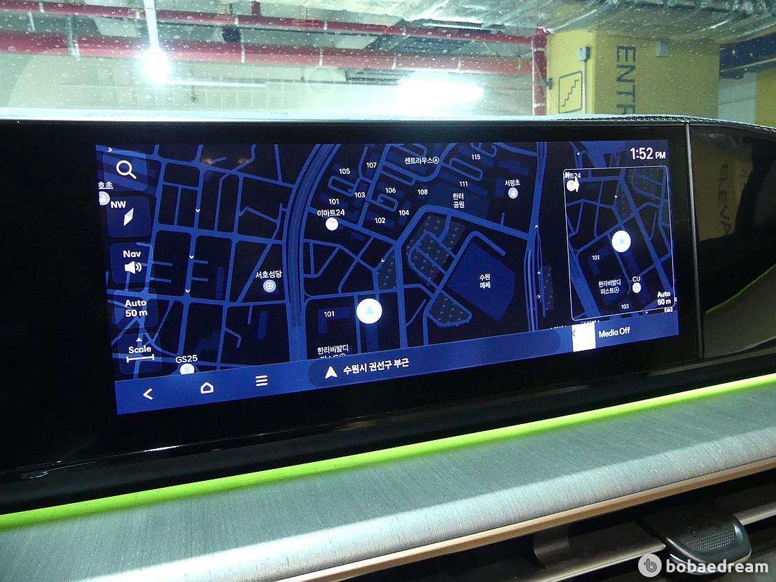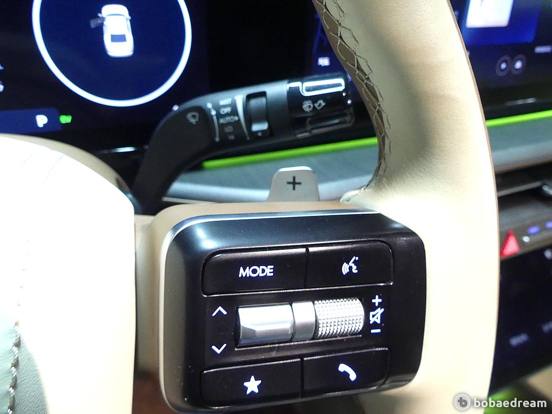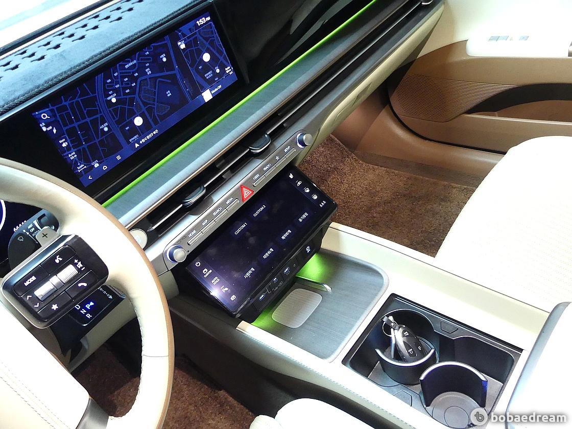 10.25인치 대화면 통합 공조 콘트롤러를 탑재했다. 컬럼타입 전자식 변속 레버는 스티어링 휠(운전대)로